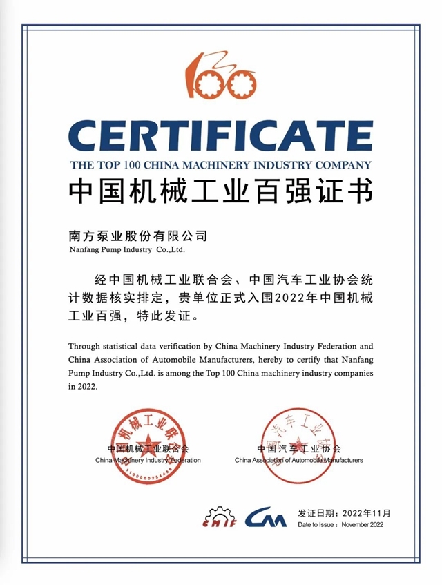 喜报丨中金环境旗下子公司南方泵业成功入围2022年中国机械工业百强!